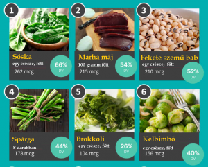 - Napi szükséglet: 300–500 µg. Ez a mennyiség megtalálható például 100 g savanyú káposztában, 250 g baromfimájban vagy 100 g spenótban.